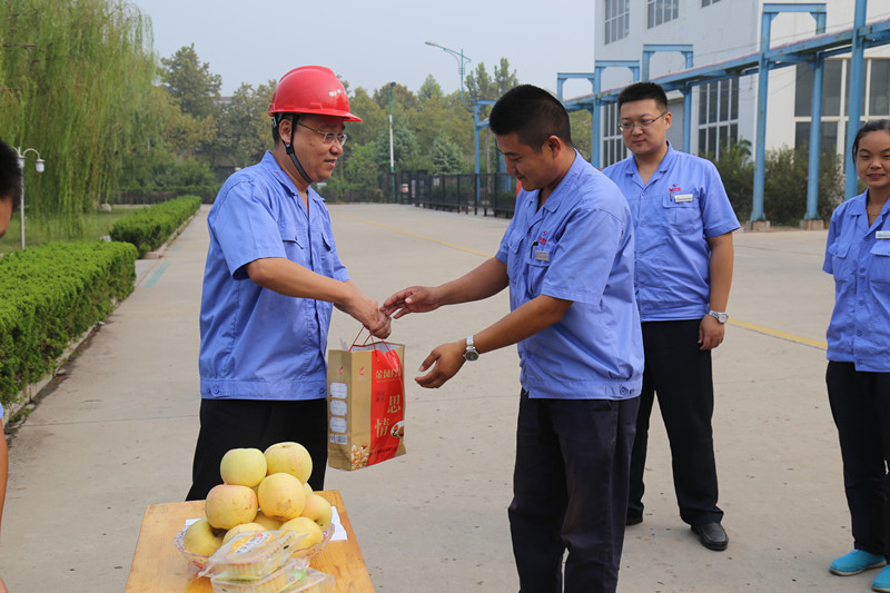 鲁泰化学自成立以来,始终坚持"以人为本",把关心职工生活作为一项突出工作来抓。9月15日是一年一度的中秋佳节,当日上午,总经理申玉海带领党群部工作人员,组织开展"迎中秋,送温暖"慰问一线职工活动,给他们送去月饼、苹果。