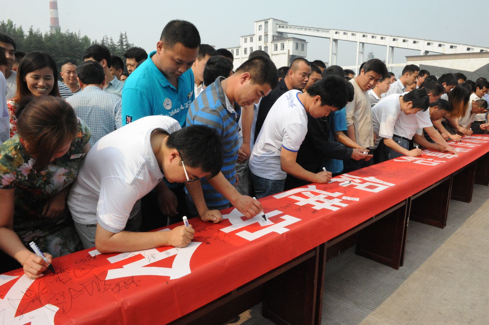 随后,在采掘办公楼前,副总工程师以上领导、机关科室人员及生产区队干部职工代表400余人,在写有"强化红线意识,促进安全发展"的条幅上签上自己的名字,保证安全生产。接着,矿领导班子成员同干部职工一同到采掘楼大厅观看了安全月宣教图片展览。